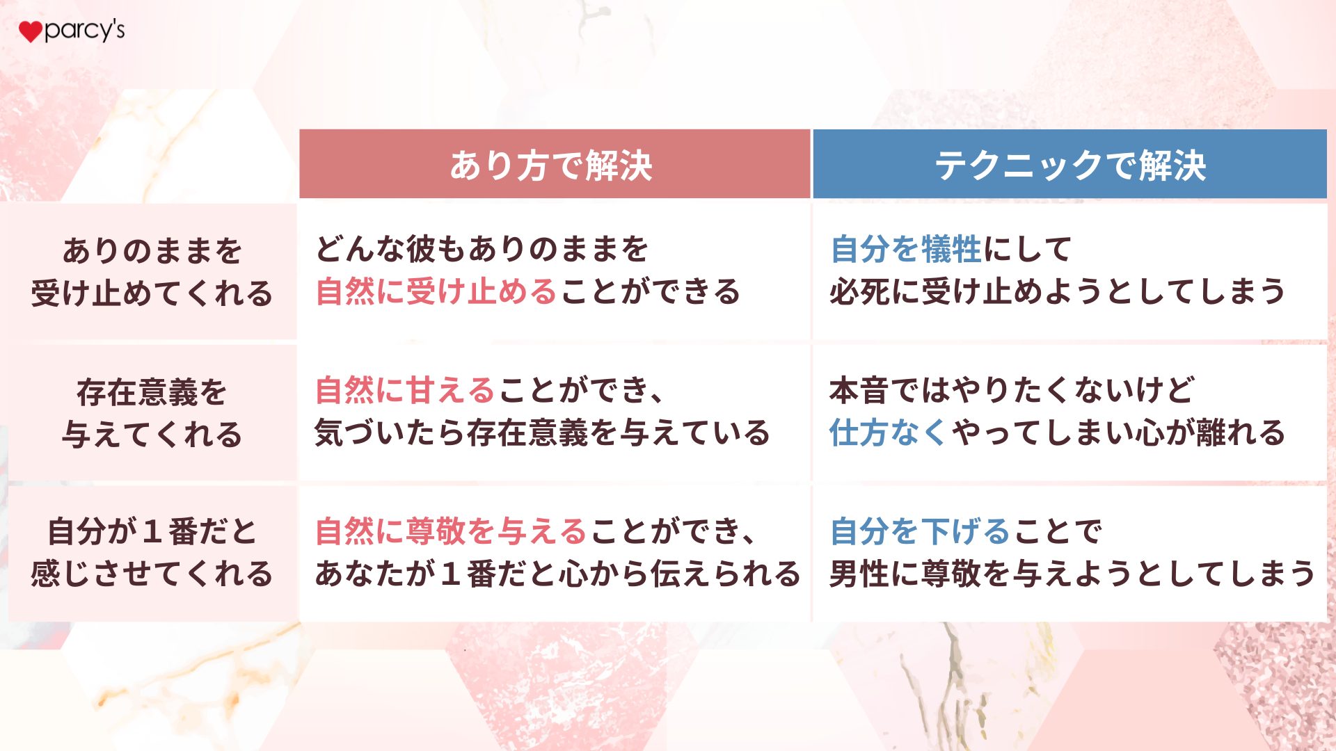 parcy'sで学ぶと、以下のような恋愛・結婚・婚活でおこりがちな悩みから抜け出すことができる。