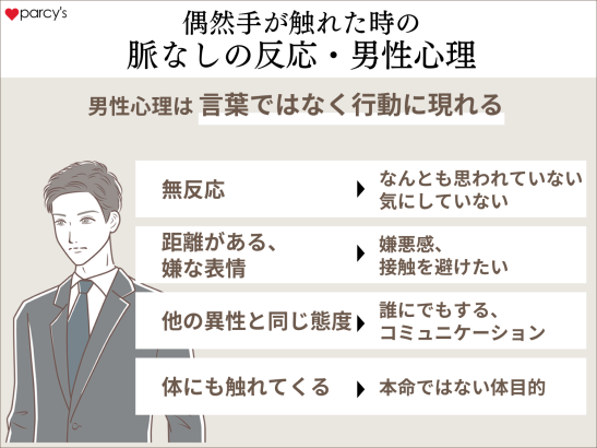 ここでは、偶然手が触れた時の脈ありの反応とともに男性心理を解説していこう。