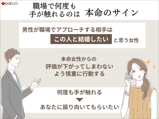 そんな職場恋愛のなかにおいて、偶然を装い何度も手に触れようとするのは勇気のいる行動であり、あなたに振り向いてもらいたいという男性心理が表れている。