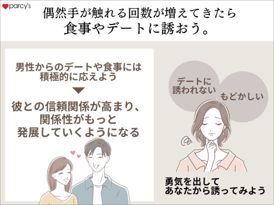 もし、何度も手が触れるのになかなか食事やデートに誘われないともどかしい気持ちがある方は勇気を出してあなたから誘ってみるのもいい。