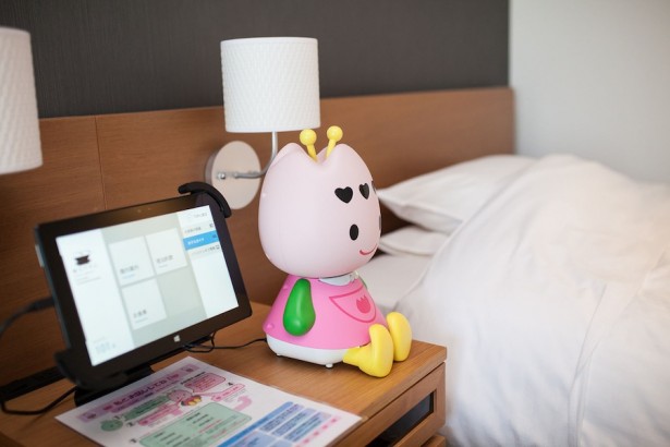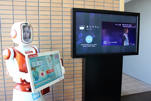 おもてなしロボット「サッチャン」はゲームやおしゃべりなどで、宿泊客を楽しませるのが役目。