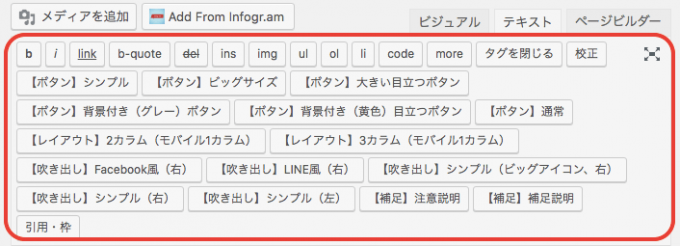 WordPress(ワードプレス)で記事を作成しているとき、コードを使用することがあると思うが、頻繁に使うコードを簡単に使えるように本文上部にクイックタグを表示するというものだ。