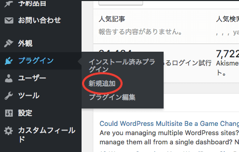 ダッシュボードの左にあるメニューから「プラグイン」「新規追加」を選択する。