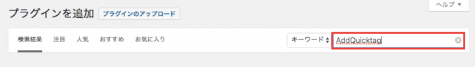 お目当てのプラグインは決まっているので、「キーワード」に直接「AddQuicktag」と入力する。