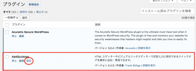 「プラグイン」メニューの「インストール済みプラグイン」をクリックすると、先ほどインストールしたAddQuicktagが表示されているので、「設定」を選択。