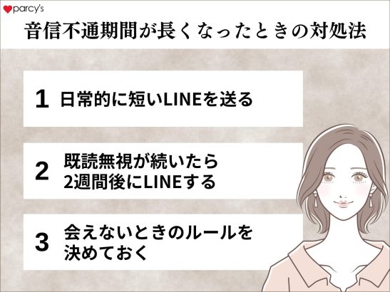 なかなか会えない彼との関係が心配になるなかで、音信不通でも「大丈夫」と信じていいのか、いつまで待てばいいのか、本当は終わっているのではないかなど、不安にもなるだろう。