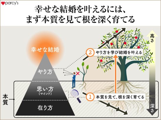 幸せな結婚をするためには、やり方を学ぶ前に、きちんと自分自身の本質を見て、根を深く育てることが大切だ。
