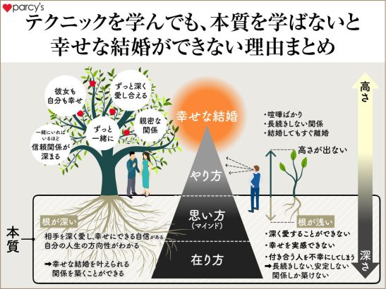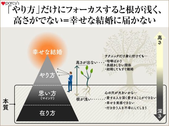 以前の記事「【男性向け】幸せな結婚をするための「学ぶべき順番」」でも伝えたが、やり方=恋愛テクニックや男女心理などだけを学んでも、根が浅く弱い樹木が大きく育たないのと同じで、幸せな結婚まで届くことはない。