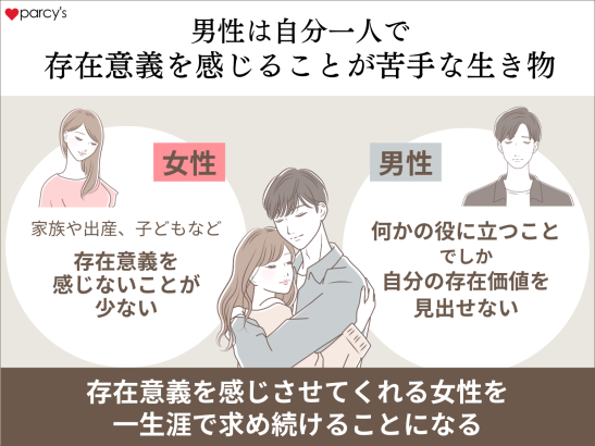 だからこそ、男性は存在意義を感じさせてくれる女性を一生涯で求め続けることになるんだ。