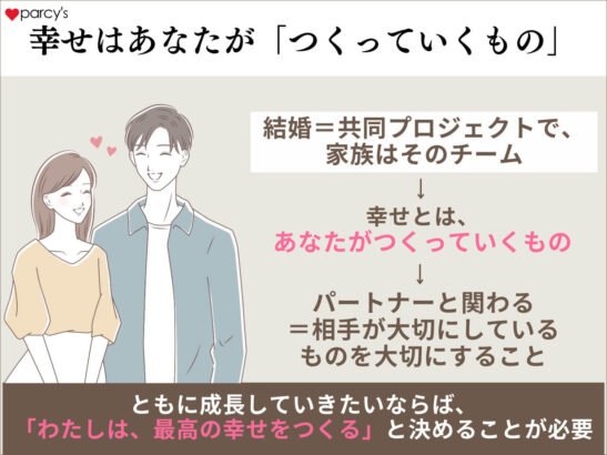 結婚だけでなく、仕事や人間関係まで”人生まるごと”を好転させていく。 parcy'sで叶うのは、ゴールとしての結婚ではなく、一生続く“あなたらしい幸せな結婚”だ。
