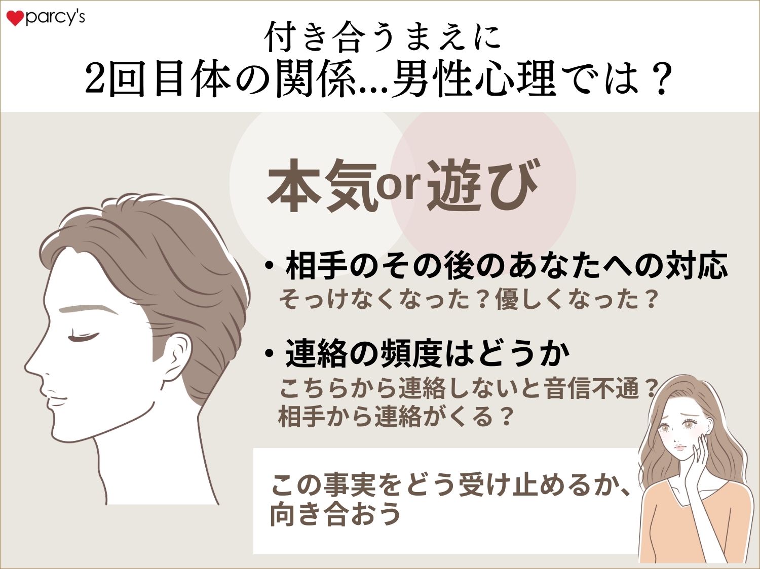 2回目…となった時、やること前提な態度をしていたり、素っ気ない態度になって、その時だけ優しくなるのは遊び確定だろうし、本気だったら、付き合う前にやる流れになったことについてお互いの意思確認をしたり、交際前提な前向きな発言や態度になるからね。