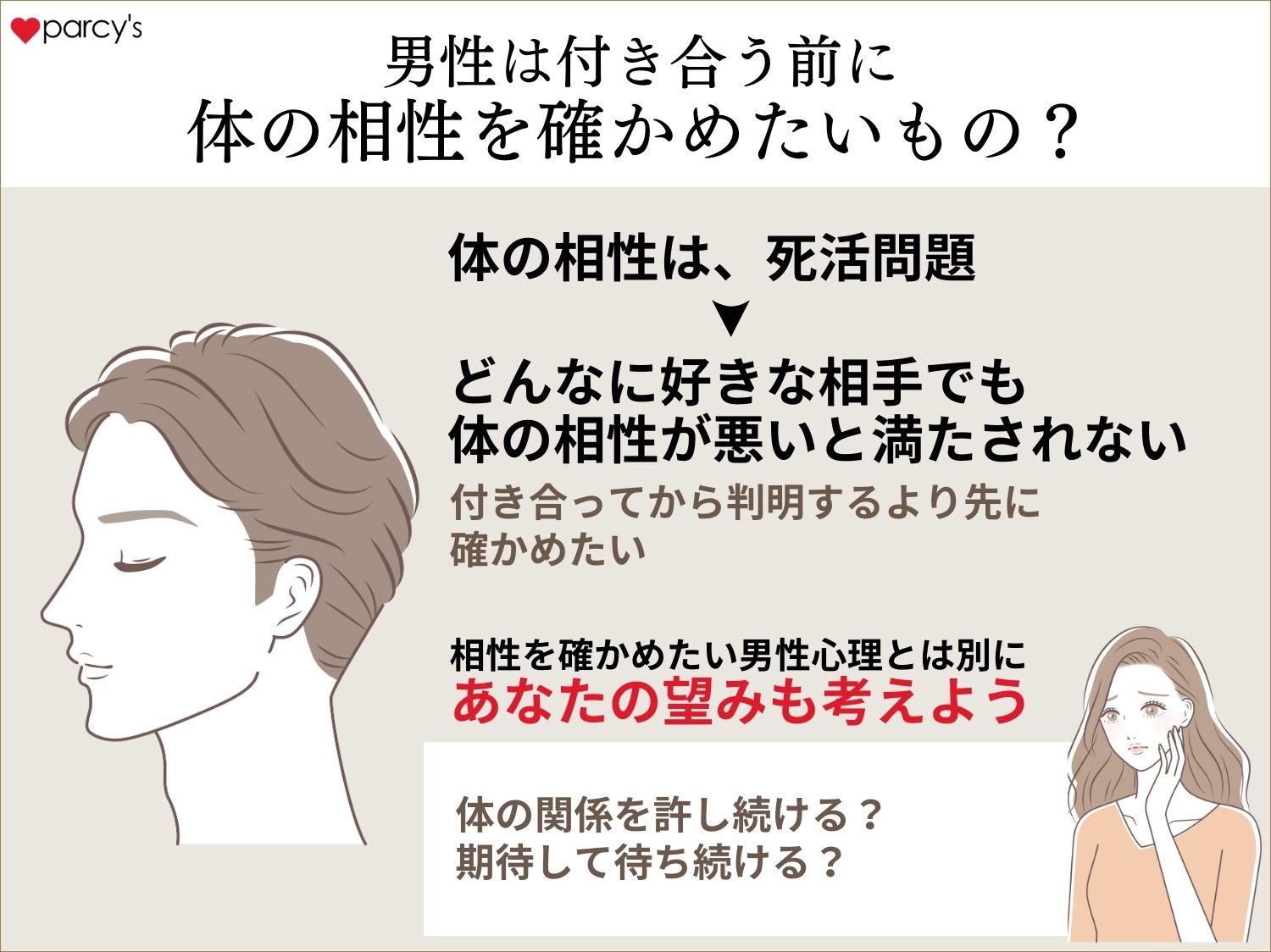 体の相性を確かめたい…その結果、ダメだったってこと?なんて考えると、女性としては正直、ひどく傷つくだろうし、そこまでの人に体を許したことに、後悔も生まれるかもしれない。