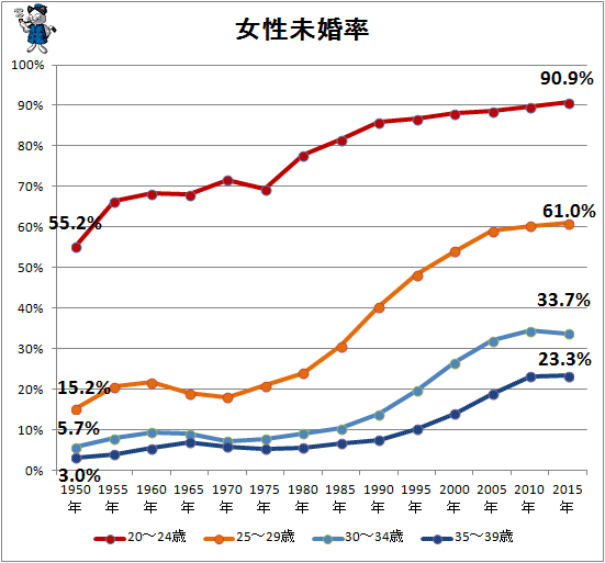 女性の社会進出にともなって、年々女性の未婚率が増えていっている。
