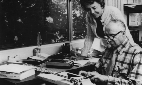 ピーター・ドラッカーの執筆を見守るドリス