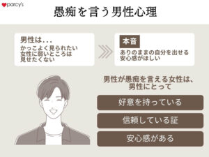 2024.01.15 AKIRA 3 FacebookでシェアTwitterでシェア Tweet FacebookでシェアTwitterでシェア parcy's note(パーシーズノート) > Full width page > parcy’sメソッド > 本音を聴く技術 > 【図解】男性が愚痴を言えるアラフォー女性は好かれる?弱みを見せる・仕事の愚痴をこぼす男性心理 > 3