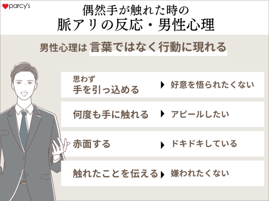 ここでは、偶然手が触れた時の脈ありの反応とともに男性心理を解説していこう。