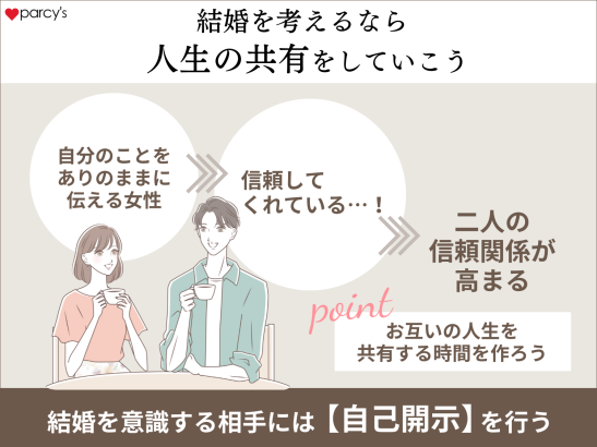 結婚を意識する相手に対しては「自分はこういう人間だ」ということを伝える【自己開示】を行う必要がある。