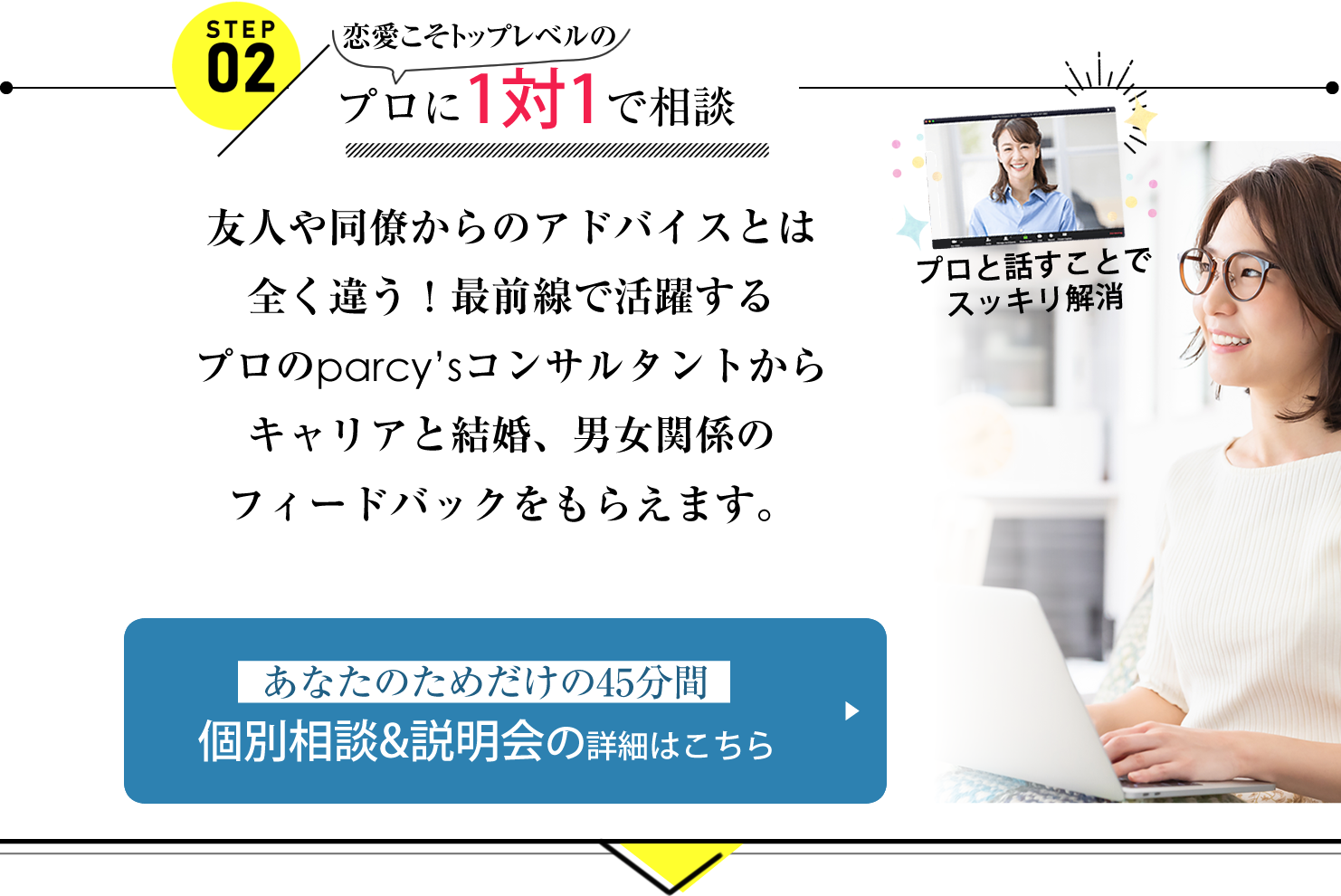 男女関係専門のプロのparcy'sコンサルタントに相談できる。ぜひ受けてみよう!