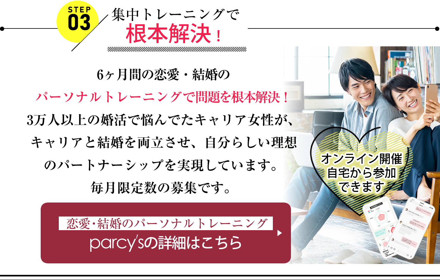恋愛結婚のパーソナルトレーニング「parcy’s」では、「婚活が長期化している」「付き合っても長続きせず結婚まで進まない」「好きな人と毎回同じパターンで別れてしまう」 そんな悩みを抱える方が、1年以内に自分らしい幸せな結婚するトレーニングスタジオです。