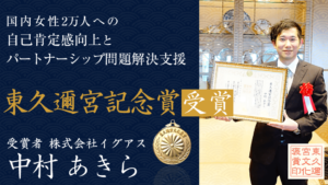 2021.06.05 AKIRA 「東久邇宮記念賞」を受賞しました!国内女性2万人への自己肯定感向上トレーニング支援実績が 評価 FacebookでシェアTwitterでシェア Tweet FacebookでシェアTwitterでシェア parcy's note(パーシーズノート) > Full width page > ビジネス > お知らせ > 【お知らせ】「東久邇宮記念賞」を受賞しました!国内女性2万人への自己肯定感向上トレーニング支援実績が評価 > 「東久邇宮記念賞」を受賞しました!国内女性2万人への自己肯定感向上トレーニング支援実績が 評価