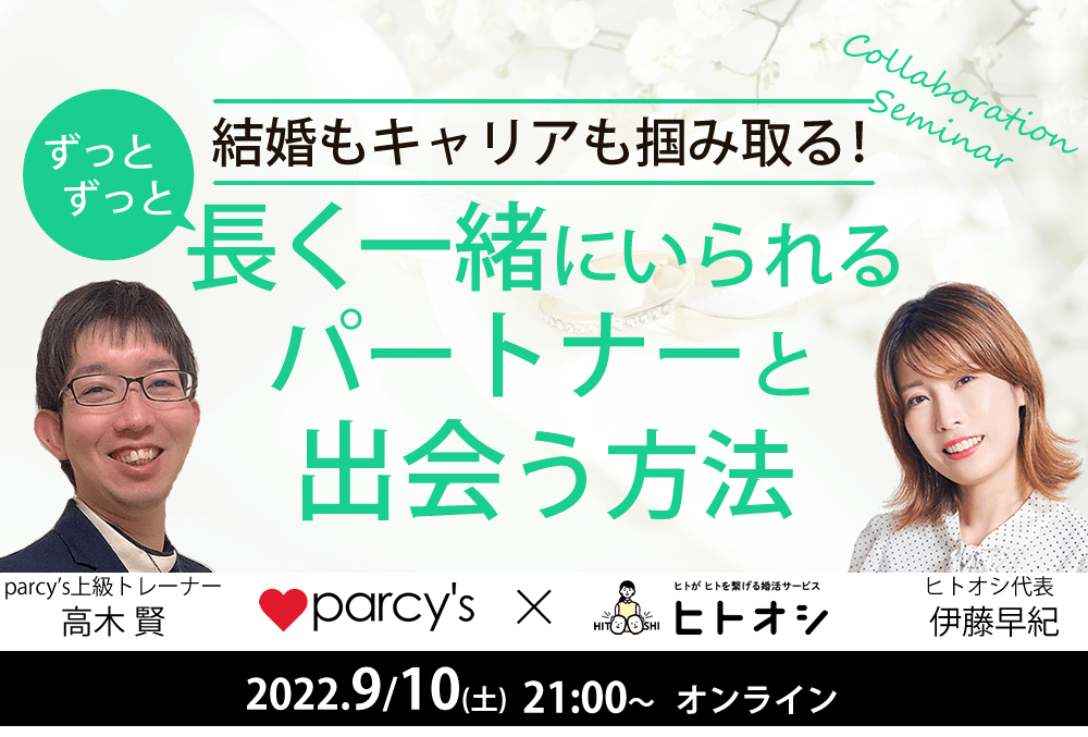 2022.09.03 AKIRA 「parcy’s×ヒトオシ」コラボセミナー『結婚とキャリアをつかみとり、ずっとずっと長く一緒にいるパートナーと出会う方法』 FacebookでシェアTwitterでシェア Tweet FacebookでシェアTwitterでシェア parcy's note(パーシーズノート) > Full width page > ビジネス > お知らせ > 9月10日「parcy’s×ヒトオシ」コラボセミナー『結婚とキャリアをつかみとり、ずっとずっと長く一緒にいるパートナーと出会う方法』 > 「parcy’s×ヒトオシ」コラボセミナー『結婚とキャリアをつかみとり、ずっとずっと長く一緒にいるパートナーと出会う方法』