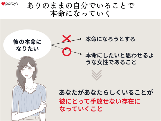 自分じゃない何かを演じて彼の本命になろうとせずに、ありのままでの自分でいられることが大切なんだということを忘れないでね。
