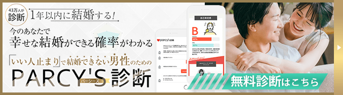 男女関係専門のプロのparcy'sコンサルタントに相談できる。ぜひ受けてみよう!【超精密】結婚できる確率がわかる!いい人止まりで悩んでいる男性のためのparcy's診断はこちら