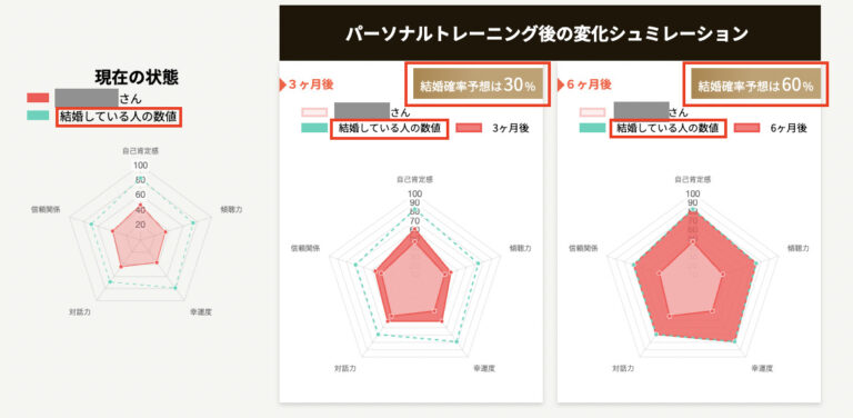 さらに、恋愛結婚のパーソナルトレーニングを受けることで、それがどのくらい変化するかも「変化シミュレーション機能」で確認可能だ。
