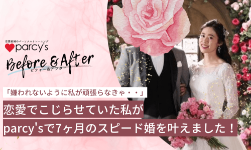 恋愛結婚のパーソナルトレーニング「パーシーズ(parcy's)」では、結婚や出産のタイムリミットを感じる「婚活が長期化している」「好きな人と毎回同じパターンで別れてしまう」 そんな悩みを抱える方が、1年以内に自分らしい幸せな結婚を実現している。