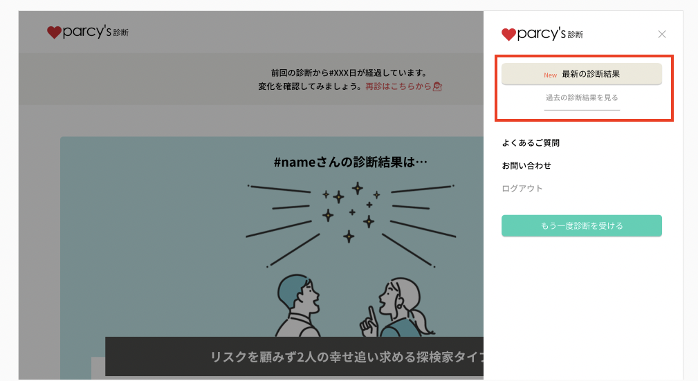 2022.04.24 AKIRA parcy’s診断過去の診断履歴画面 FacebookでシェアTwitterでシェア Tweet FacebookでシェアTwitterでシェア parcy's note(パーシーズノート) > Full width page > parcy’sメソッド > 自己肯定感を高める方法 > 「parcy’s診断」に自分の変化推移が一覧でわかる機能が追加しました!自分の診断結果をチェックしてみよう! > parcy’s診断過去の診断履歴画面