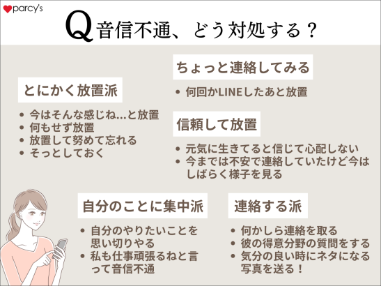 parcy’sには、「男性が突然音信不通になった」という悩みが寄せられることが多い。女性自身もキャリア女性や仕事に全力で取り組む忙しい女性が多いため、会ってデートすることが難しい中で、連絡さえ取れないとなると、どうやって関係を深め、結婚に進んでいけばいいのかわからないと悩むのだ。