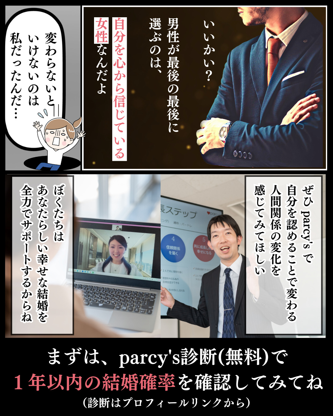 こじらせ婚活を卒業!1年以内に自分らしい幸せな結婚する!parcy's個別相談&説明会はこちら