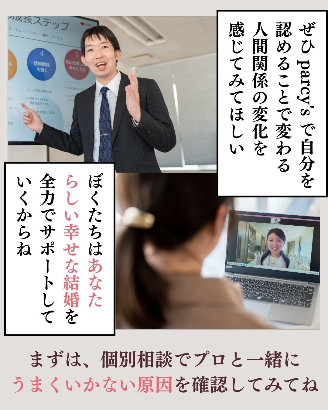 『心から信頼し合える幸せな結婚と自己肯定感の関係を徹底解説』です。 今だけ無料です!ぜひ参加してくださいませ。 →parcy'sオンラインセミナーはこちら 出会いや相手の本気度だけが原因で結婚できないと思っていませんか?自分も変わらないと婚活や結婚はうまくいきません。 「parcy's」(パーシーズ)は、「結婚・出産のタイムリミットを感じて焦る」「婚活が長期化している」「付き合っても長続きせず結婚まで進まない」「好きな人と毎回同じパターンで別れてしまう」 そんな悩みを抱える方に、1年以内に自分らしい幸せな結婚を実現するためのトレーニングスタジオだ。 parcy'sで学ぶと、以下のような恋愛・結婚・婚活でおこりがちな悩みから抜け出すことができる。