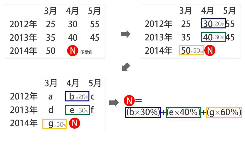 2012年の実績の20%、2013年度の実績の30%、2014年3月の実績を50%…とそれぞれの値を総和を出すだけです。