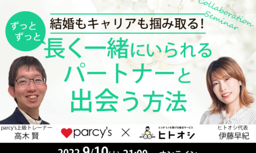 恋愛結婚のパーソナルトレーニング「パーシーズ(parcy's)」では、結婚や出産のタイムリミットを感じる「婚活が長期化している」「好きな人と毎回同じパターンで別れてしまう」 そんな悩みを抱える方が、1年以内に自分らしい幸せな結婚を実現している。