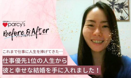 恋愛結婚のパーソナルトレーニング「パーシーズ(parcy's)」では、結婚や出産のタイムリミットを感じる「婚活が長期化している」「好きな人と毎回同じパターンで別れてしまう」 そんな悩みを抱える方が、1年以内に自分らしい幸せな結婚を実現している。