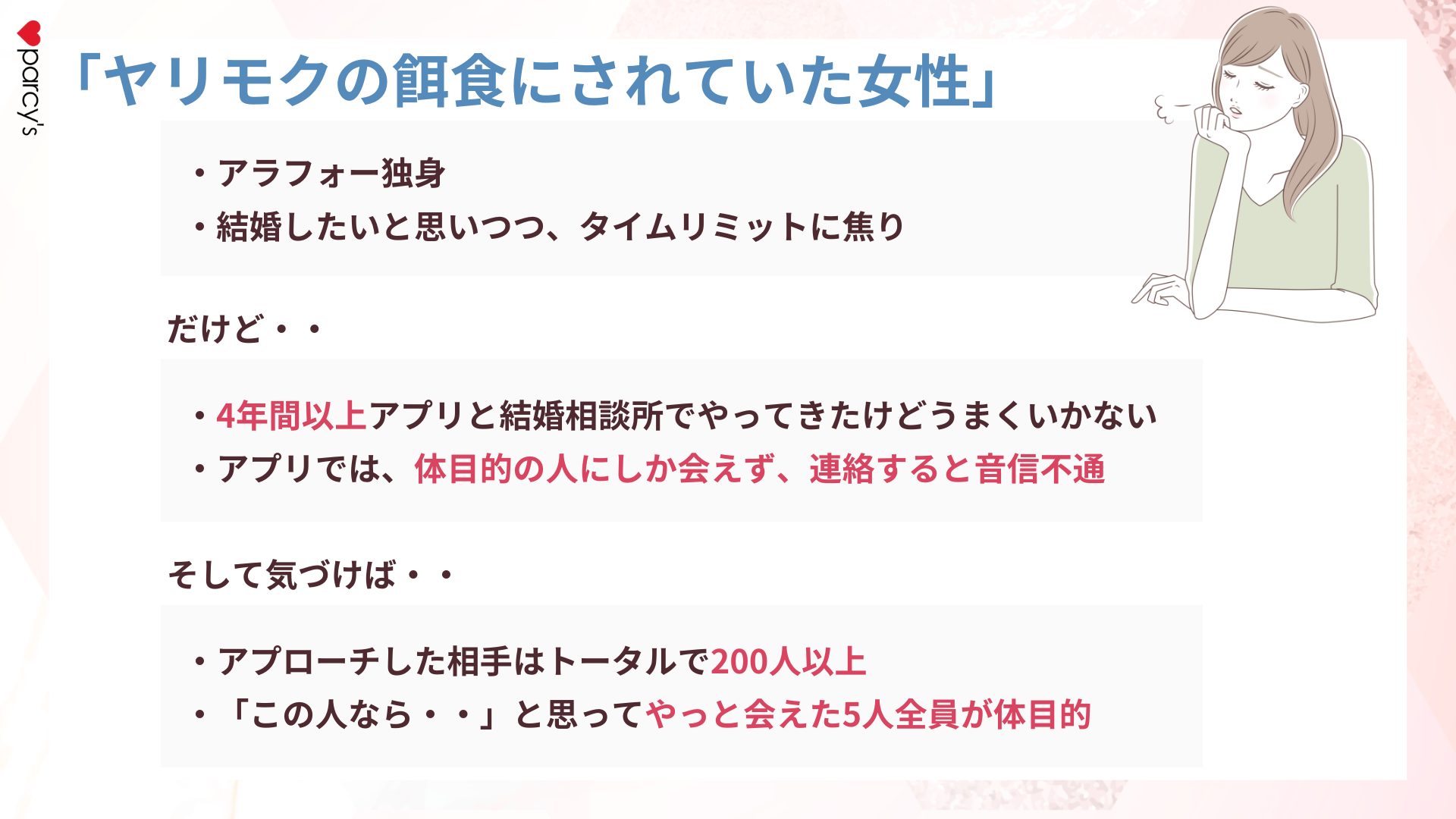 parcy’sの個別相談&説明会にこられた方の中にも、「ヤリモクの餌食にされた」という方がいた。
