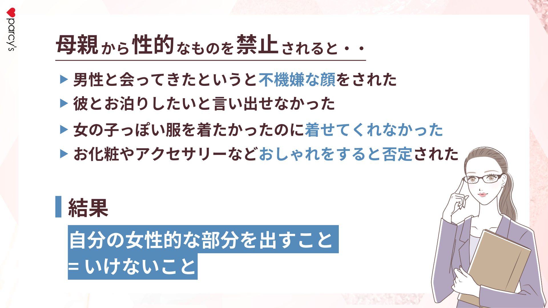 こういう育てられ方をすると、自分の女性的な部分を出すことが「いけないこと」だと思ってしまう。