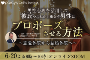 2022.06.28 AKIRA eventcover220620 FacebookでシェアTwitterでシェア FacebookでシェアTwitterでシェア parcy's note(パーシーズノート) > ランディングページ > オンラインセミナー『男性心理を活用して、彼氏や出会う男性にプロポーズさせる方法』 > eventcover220620