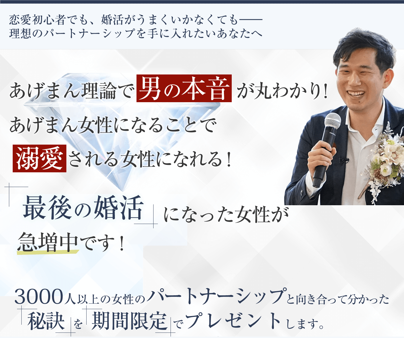 ここまでで男性の本質や溺愛される方法は理解してきたはずです。 パートナーを探している女性に多いのが、顔や年収、自分と同じレベルかそれ以上、そして尊敬できるかどうかを重要視しているということです。しかしそれだと、不倫やだめんずを選んでしまう可能性がかなり高いことと、見つけたとしても既婚者しかいないということが沢山あります。 またパートナーがいる方は、彼氏だけがどんどん成長したり、成功すると心が離れていくことが沢山あります。そうならないためにお互いである定期的に行うべき儀式を作っておくことが重要です。 さあ、このあげまん理論5ステップ動画講座を見て、人生を変えましょう。 |