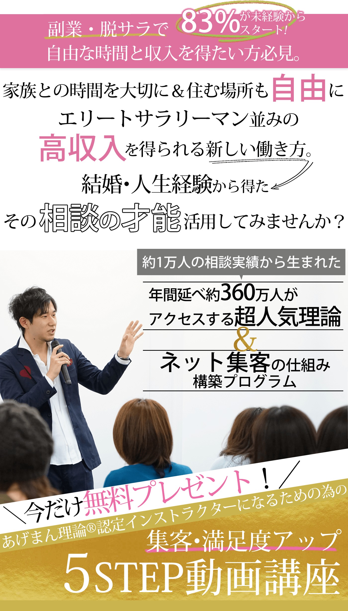 あげまん理論®︎認定インストラクターは、結婚に悩む男女を結婚まで導き、幸せなパートナーシップを築ける人間へと育てる職業です。