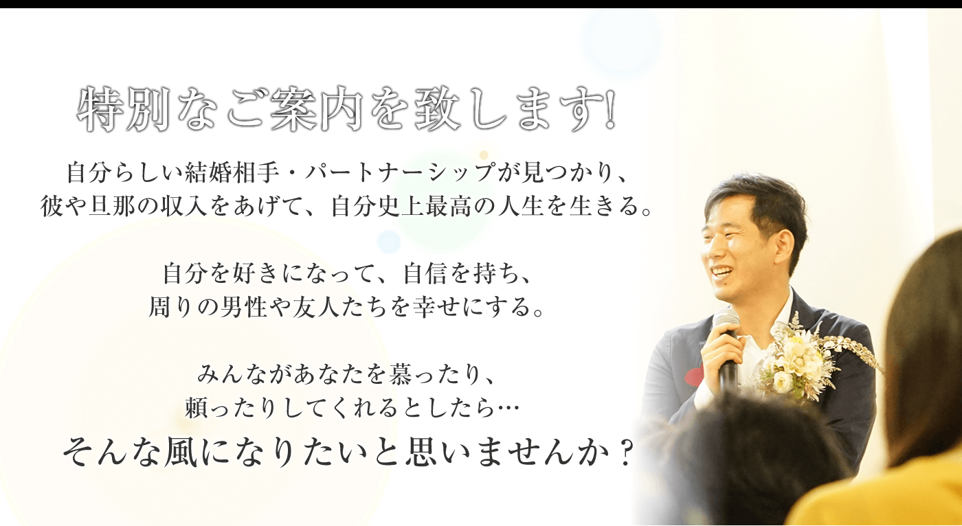 お話をお聞きする中であげまん理論アカデミーがお役に立つのであれば、どんなことを学べるのか、どんな行動していけば良いのか、お話できればと思っています。