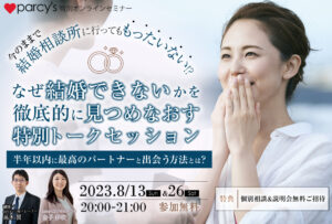2023.08.03 AKIRA eventcover230813-26blu (1) FacebookでシェアTwitterでシェア FacebookでシェアTwitterでシェア parcy's note(パーシーズノート) > ランディングページ > オンラインセミナー『なぜ結婚できないかを徹底的に見つめなおす特別トークセッション』 > eventcover230813-26blu (1)