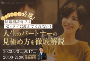 2023.08.30 AKIRA eventcover2309-1 FacebookでシェアTwitterでシェア FacebookでシェアTwitterでシェア parcy's note(パーシーズノート) > ランディングページ > オンラインセミナー『結婚相談所では絶対に教えてくれない!人生のパートナーの見極め方を徹底解説』 > eventcover2309-1