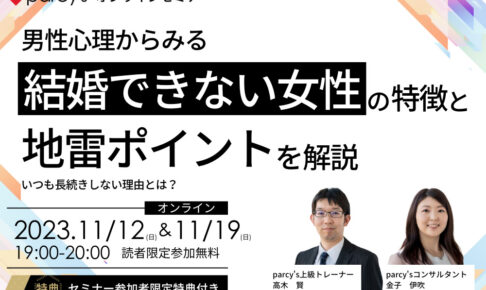 日時 2023年11月12日(日)19時~20時 2023年11月19日(日)19時~20時 恋愛結婚のパーソナルトレーニング「parcy’s」(パーシーズ)は、「1年以内に結婚する!」コンセプトに、男女ペアのトップレベ…