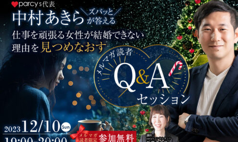 日時 2023年12月10日(日)19時~20時 \12月特別企画!!/ 今回のテーマは・・・ parcy’s代表「中村あきら」がズバッと答える! 『仕事を頑張る女性が「結婚できない理由」を見つめ直す Q&a…