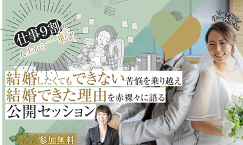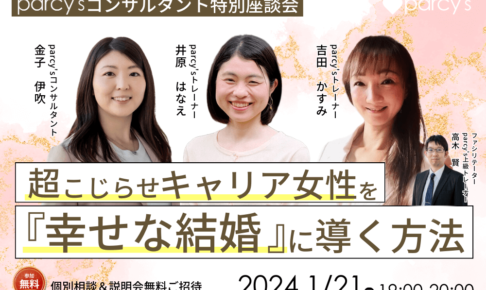 parcy’sオンラインセミナー 今回のテーマは・・・ \「仕事9割」の人生から一転!/ 『結婚したくてもできない苦悩を乗り越え「結婚できた理由」を赤裸々に語る 公開セッション』 仕事一筋の人生から、parc…