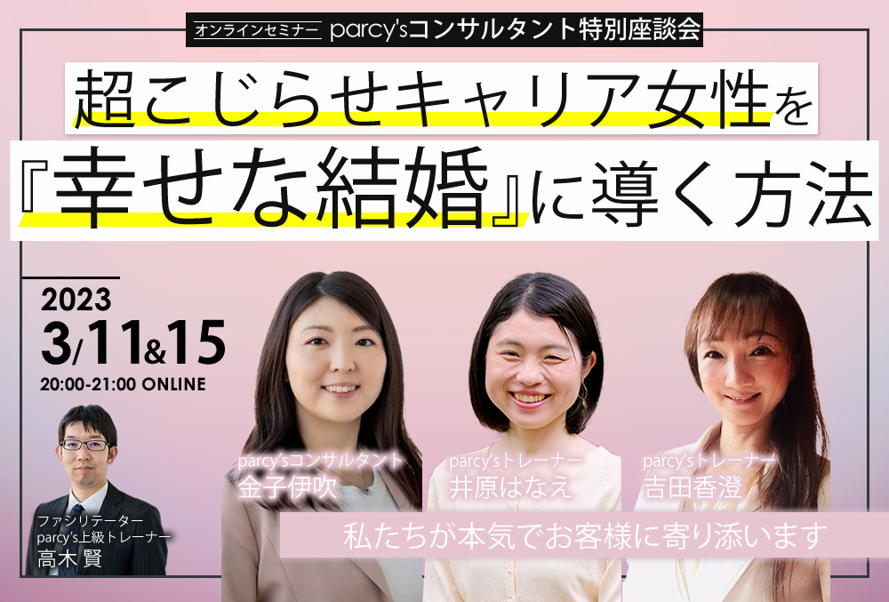 『超こじらせキャリア女性を『幸せな結婚』に導く方法』をテーマに、parcy’sトップコンサルタントが座談会形式でお話しします。