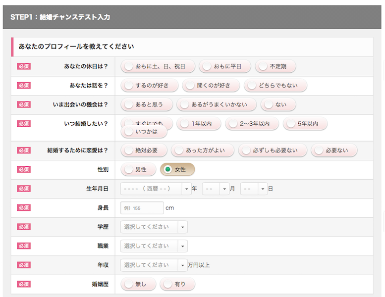 それがマッチングデータとして出てくるテストなので、婚活を始めたけど相手はちゃんと見つかるのかな。とちょっと不安になっている人にはオススメだ。