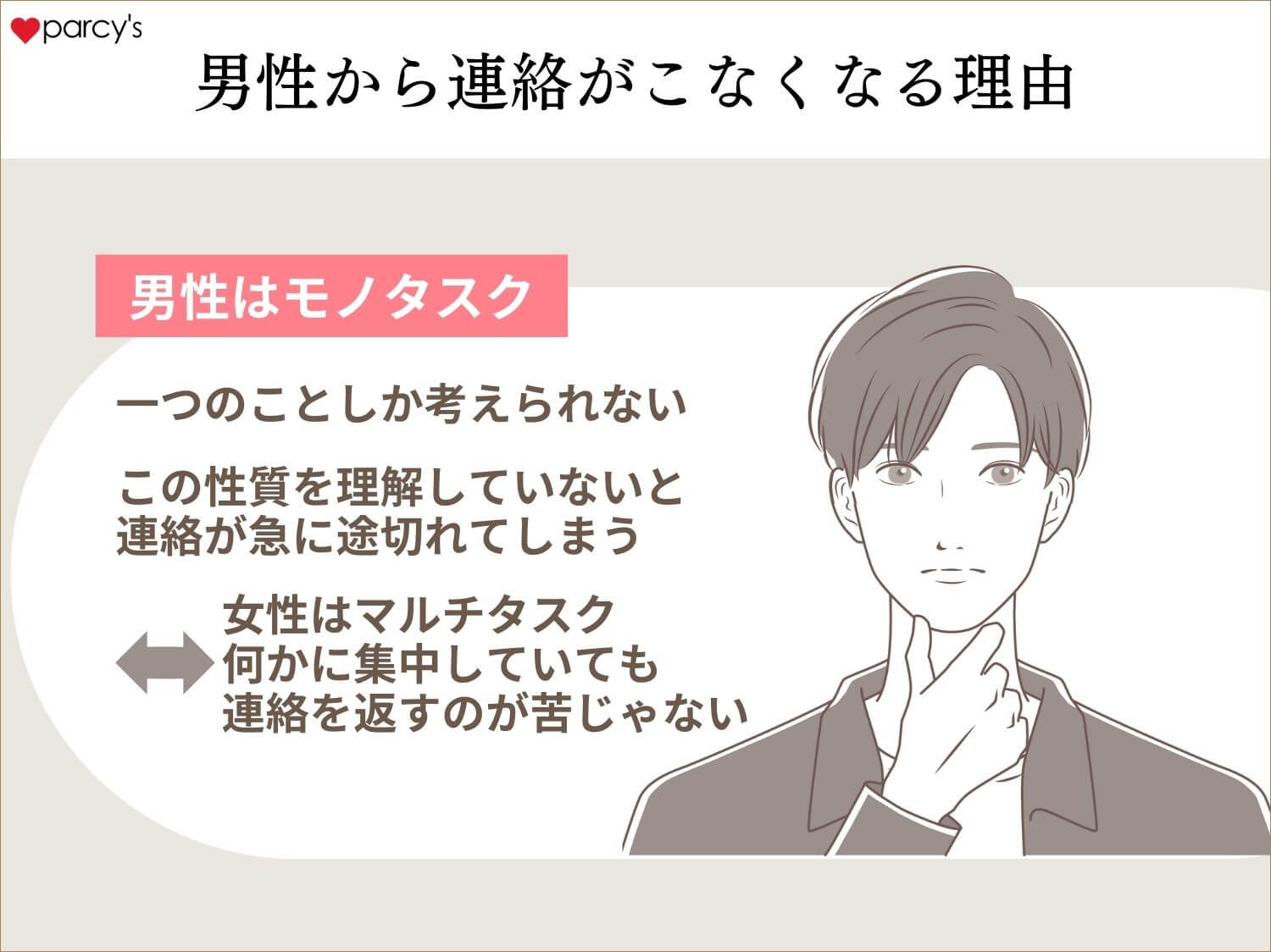 いい感じだったのに男性から急に連絡がこない・こなくなるのは、良くも悪くも「男性がひとつのことしか考えられない」性質によるものだ。